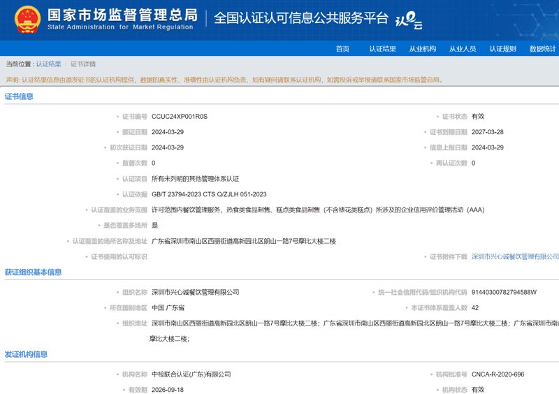 中檢聯合認證(廣東)有限公司評審深圳市興心誠餐飲管理有限公司順利通過認證!